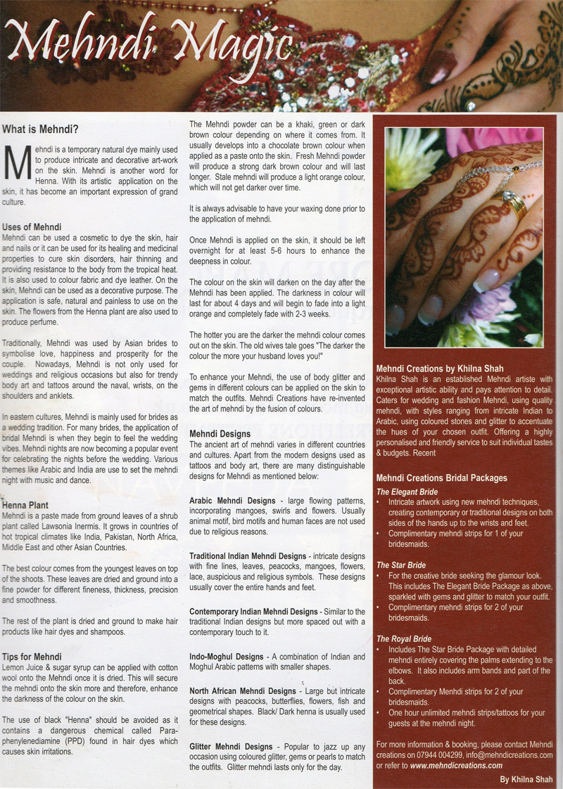 Khilna, the founder of Mehndi Creations has been interviewed and her work featured and published in: Serendip - In-flight Magazine for Srilankan airlines, PandKG Tattoo Magazine, Asian wedding magazines (Asiana, Asian Bride, Henna, Perfect Weddings),Emel & Brit Asian.
